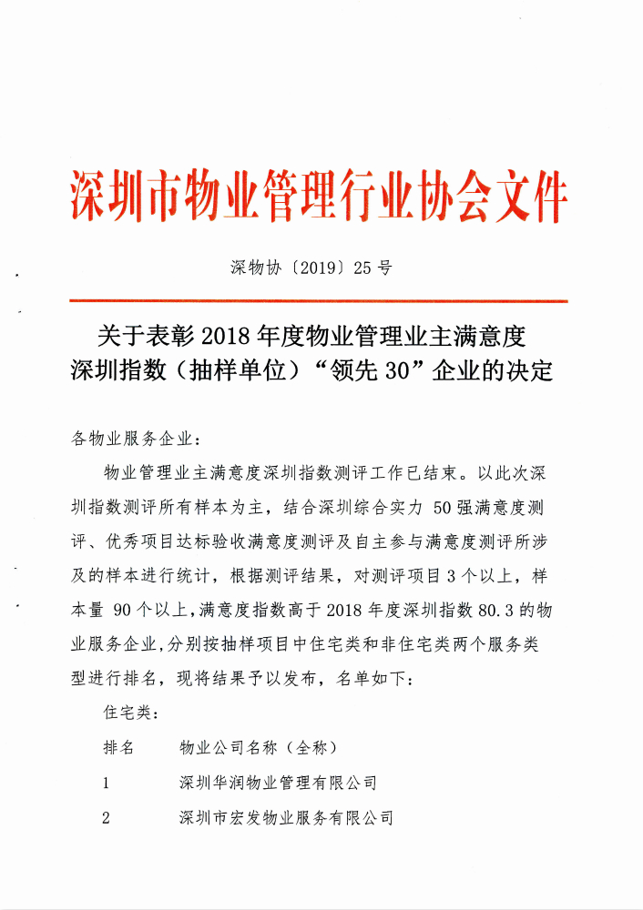 會議對獲得2018年度物業(yè)管理業(yè)主滿意度深圳指數(shù)(抽樣單位)“領(lǐng)先30”的企業(yè)代表進行了表彰授牌!
