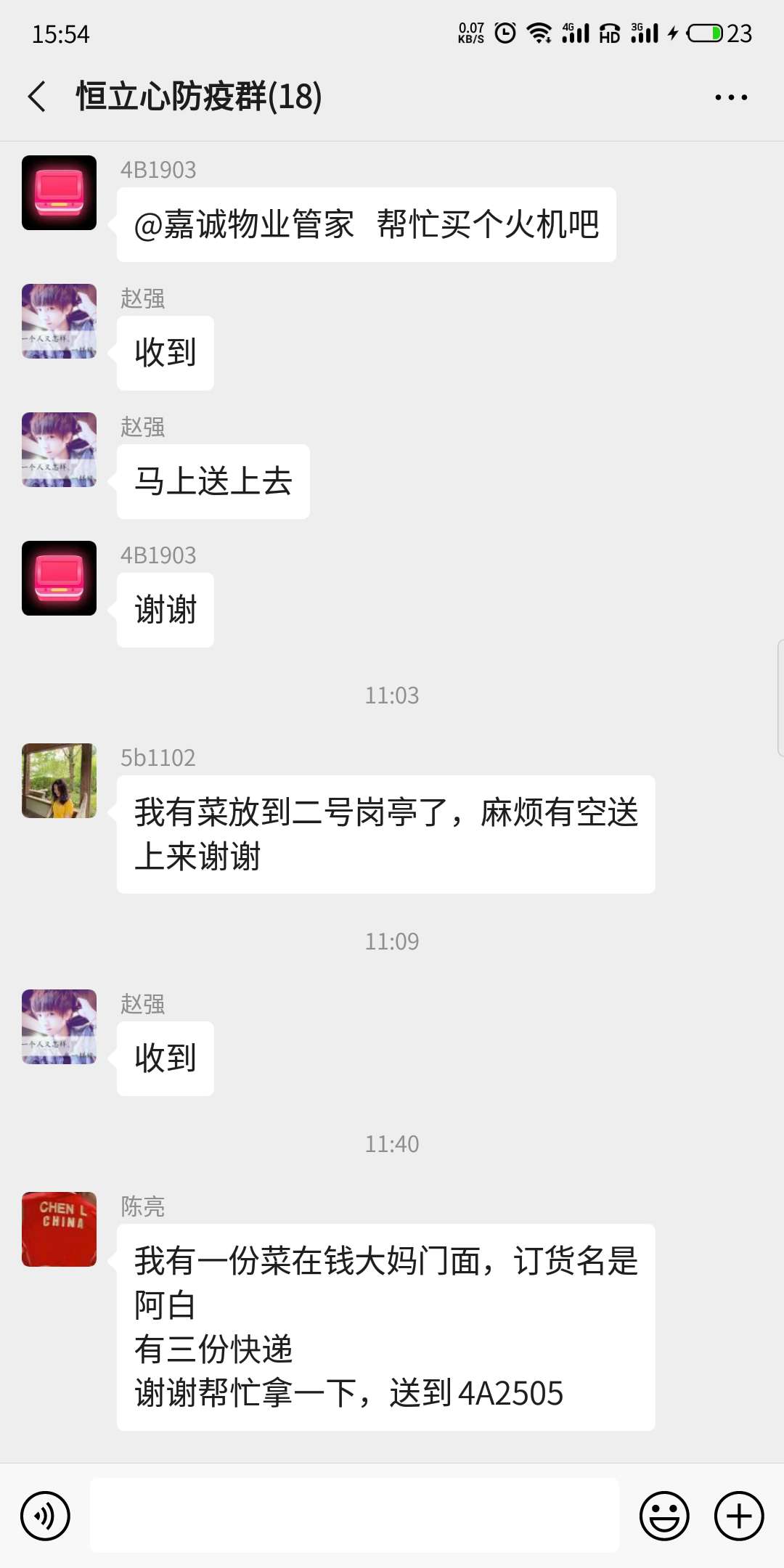 疫情無情人有情,隔離病毒不隔離愛!從門崗到各樓棟,不過百米之距,這最后的100米,卻成了一道鴻溝,周劍平尋思道,不能因為我們封閉管理就影響業(yè)主的生活,隨即他帶領(lǐng)服務(wù)中心全體員工馬上為保障業(yè)主的日常生活行動起來,事雖小,但頗多且繁瑣,勞神費力不說,且容易招致麻煩,但周劍平再三叮囑大家,服務(wù)業(yè)主無小事,于是每天從早到晚,門崗將業(yè)主的快遞.外賣按生鮮.冷凍等分類分棟擺放,根據(jù)業(yè)主反饋的電話或微信,從極為有限的防控隊員里抽人安排接力配送,或送到大堂,或送上門,張家米,李家油,王家快件,井然有序,忙得不亦樂乎,一時間,各樓棟活躍著義務(wù)愛心配送員的身影,為業(yè)主解決了燃眉之急,面對嘉誠人如此貼心周到的服務(wù),眾業(yè)主交口稱贊,無不感激!