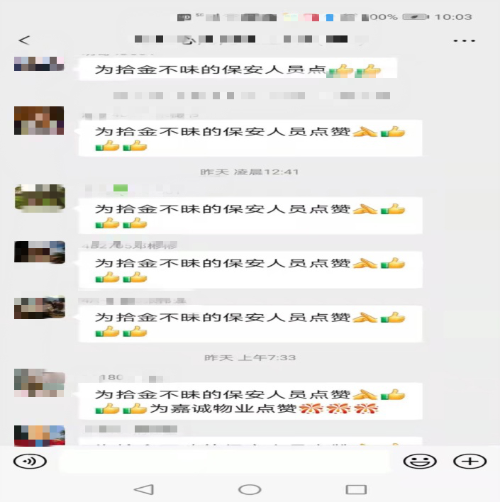 2月12日零時(shí)后,時(shí)間已經(jīng)來到了年初一,該業(yè)主夫婦攜著禮物趕到服務(wù)中心,開開心心地領(lǐng)回了錢款,并向物業(yè)服務(wù)中心一班人送上新春祝福和禮物,向安管員蔣宏伍送上紅包,這幫可親可敬的嘉誠(chéng)物業(yè)人真不含糊,無論如何也沒有收下禮物、紅包,說這是我們物業(yè)人應(yīng)該做的,您的心意我們領(lǐng)了,禮物、紅包就不必了。令人幸慰的是,該業(yè)主夫婦還在業(yè)主微信群中大大方方解釋了一番,講述遺失錢款者是自己的母親,并表?yè)P(yáng)了拾金不昧的小區(qū)物業(yè)安管員蔣宏伍等嘉誠(chéng)物業(yè)人,嘉誠(chéng)物業(yè)人,真是好樣的!剎那間,點(diǎn)贊聲聲,應(yīng)者云集,在這個(gè)美好的除夕之夜,嘉誠(chéng)物業(yè)人收獲了不一般的幸福和感動(dòng)!