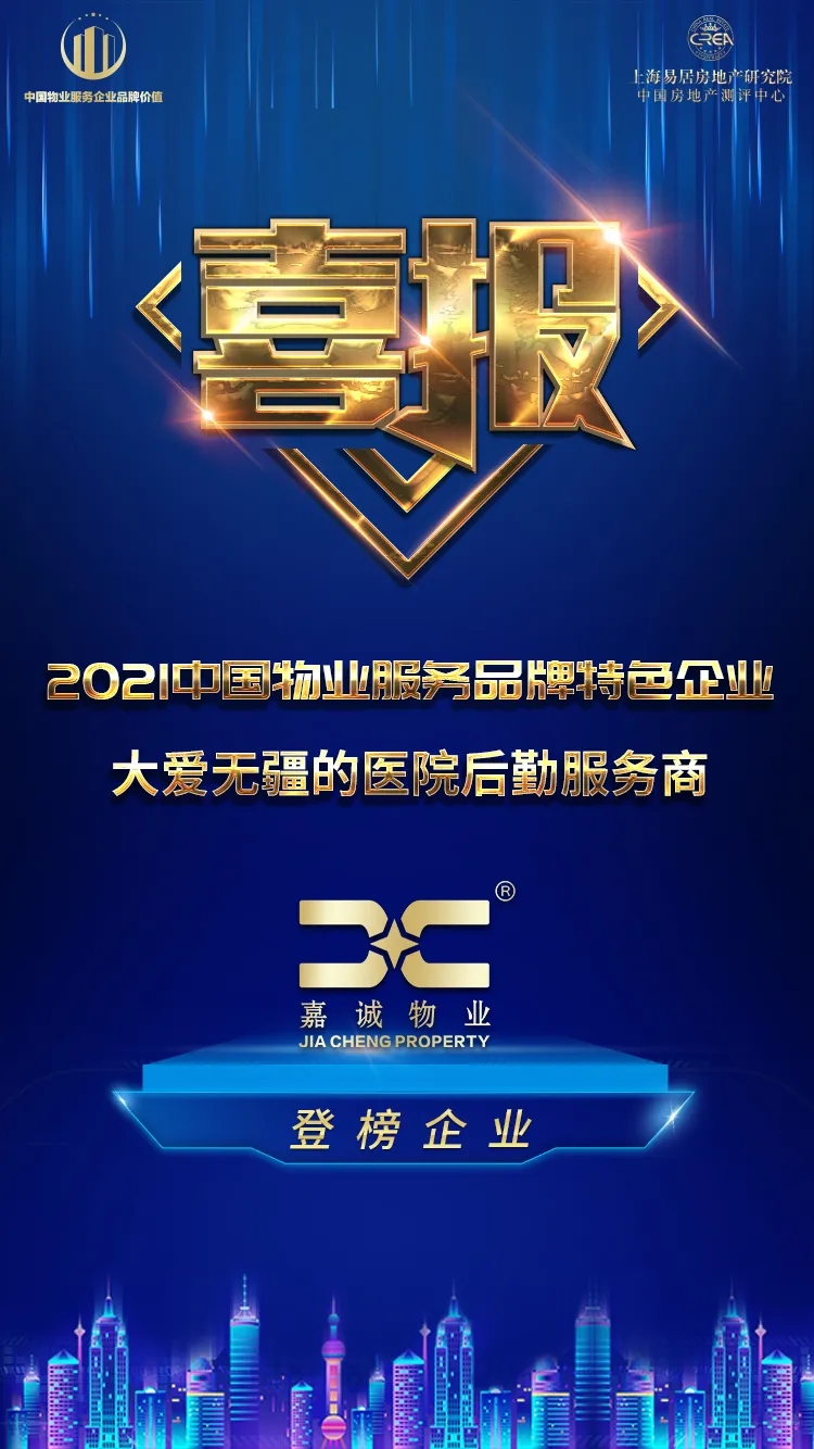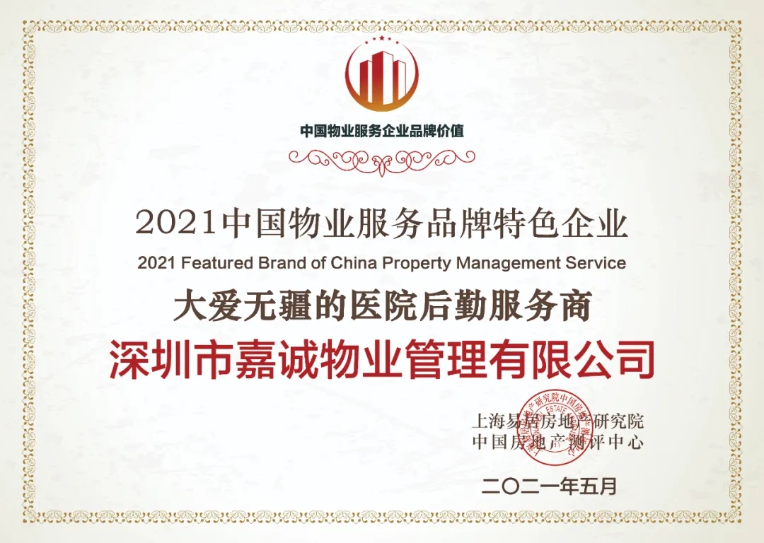 上海易居房地產(chǎn)研究院中國房地產(chǎn)測評中心同期揭曉2021中國物業(yè)服務企業(yè)品牌價值100強、物業(yè)服務品牌特色企業(yè)以及各區(qū)域物業(yè)服務品牌企業(yè)榜單。嘉誠物業(yè)榮獲“2021中國物業(yè)服務企業(yè)品牌價值100強”、“2021年中國物業(yè)服務華南品牌企業(yè)20強”及“2021中國物業(yè)服務品牌特色企業(yè)-大愛無疆的醫(yī)院后勤服務商”。