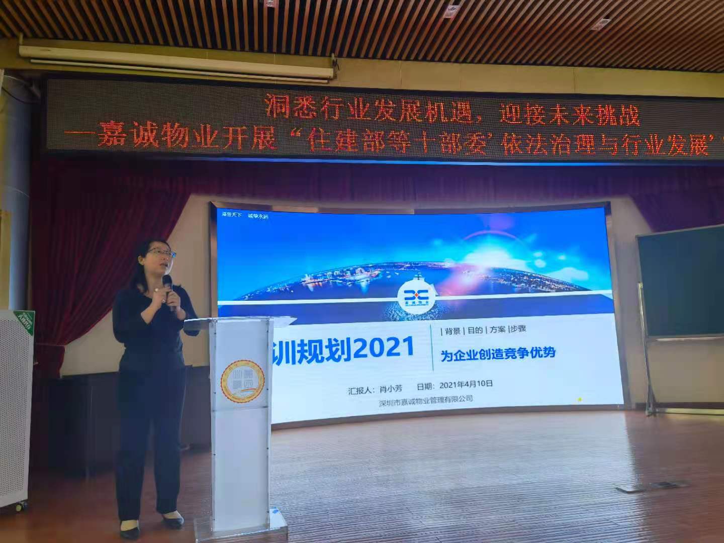在此次培訓活動中,為了促進公司培訓工作標準化、規(guī)范化,肖小芳女士還做了《嘉誠物業(yè)年度培訓計劃》相關報告;面對激烈的市場競爭形勢,為了做大做強公司,號召大家拓展市場,品牌宣傳部葉紅章先生做了《打回老家去,解放全中國》的全員拓展市場動員報告,鼓勵全體嘉誠物業(yè)人千軍萬馬奔市場,千方百計搶市場,為公司發(fā)展全力以赴!